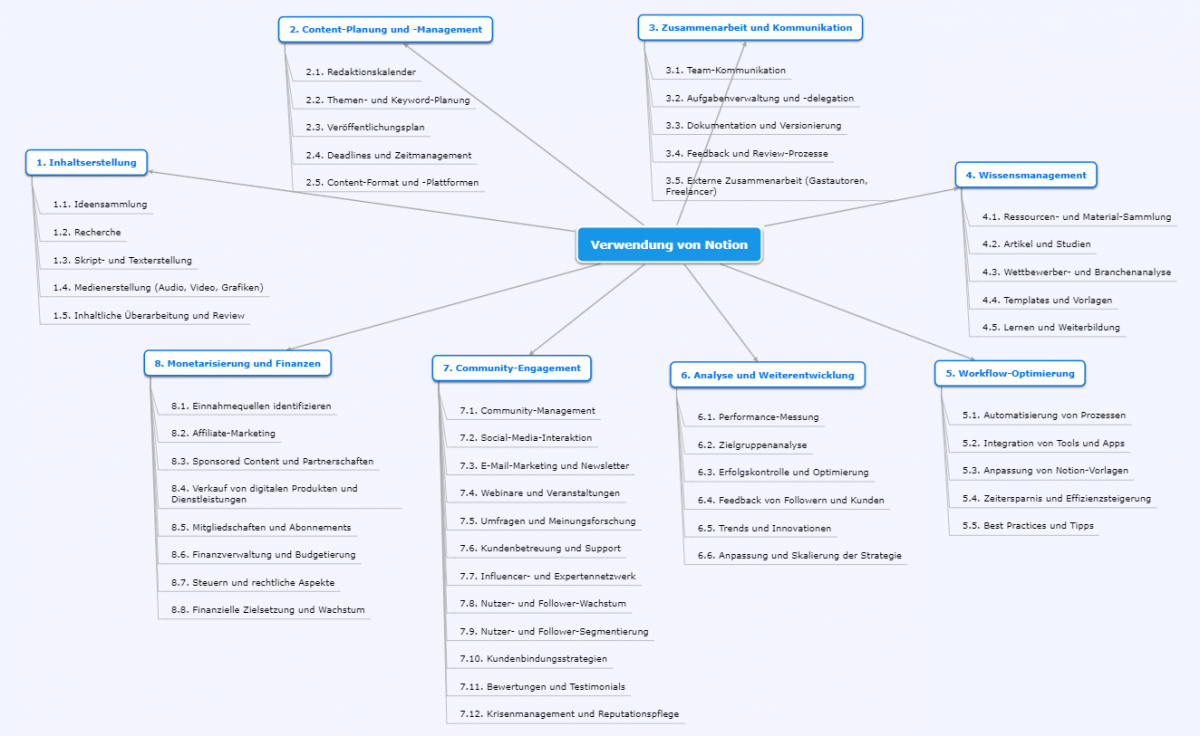 Erstelle bitte eine Mind-Map zum Thema Verwendung von Notion zur Organisation als Content Creator, indem Du die zentrale Idee, die Hauptäste und Unteräste aufzählst.